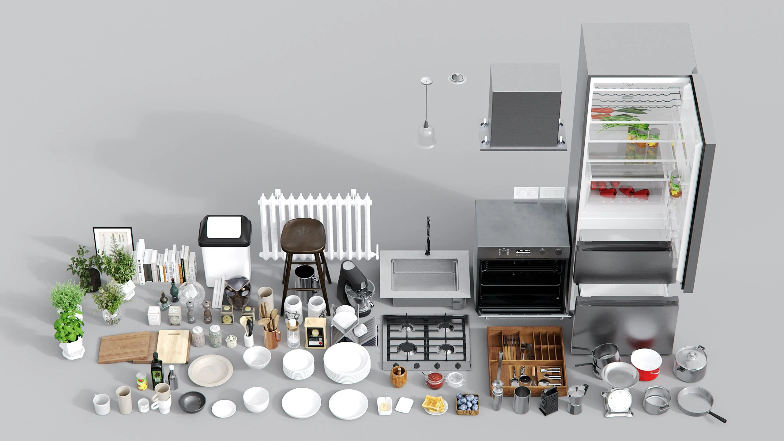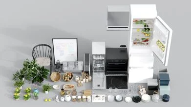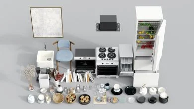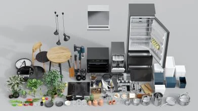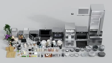 豊富な小道具(Props):オーブン、冷蔵庫、食洗機、コーヒーメーカー、調理器具、ガラス食器、装飾植物などが同梱。近接カットにも耐える高精細モデル。