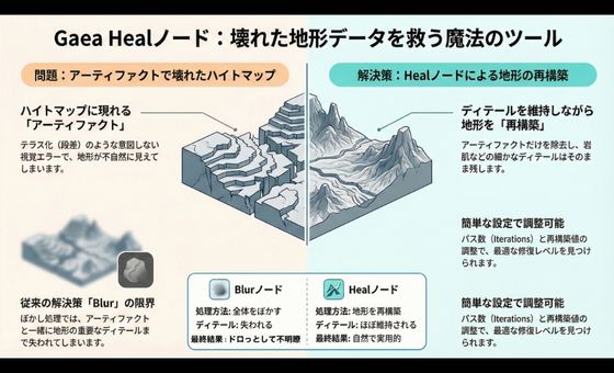 Healノードは基本的に 地形を再構築 し、元のハイトマップのディテールをできるだけ残すことで、細部を失わないようにします。