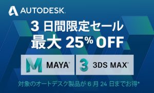 2021年6月22日(火)から2021年6月25日(木)までの期間限定で Autodesk Maya、3ds Max が最大25%OFFの特別価格でご提供!この機会に是非ご検討ください。